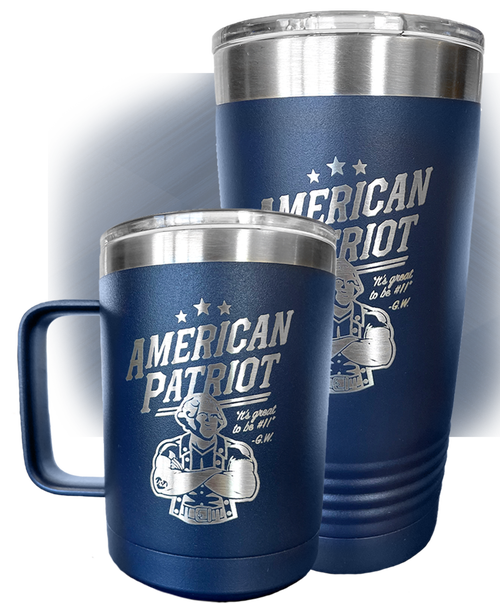 Etched in the navy-blue tumbler are the words AMERICAN PATRIOT, atop a rather muscular depiction of our nation’s first president, George Washington.
